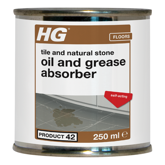 HG natural stone oil and grease absorber is an oil stain remover for natural stone that absorbs oil stains on flagstones, terra cotta, marble, sand-lime and other types of natural stone as well as cement and concrete floors. This oil absorber is a self-acting stain remover which absorbs the oil or grease from the stone.